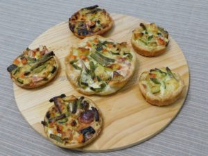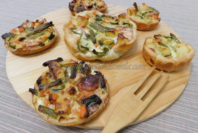 Distribuite con un mestolino o con un cucchiaio il composto all’interno di ogni stampino foderato di pasta sfoglia.