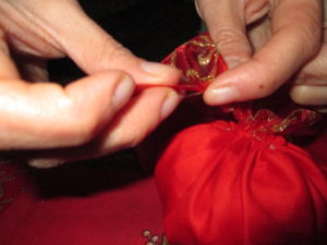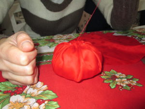 Appuntate con degli spilli la stoffa e ritagliate con cura. Prendete del filo in tinta con la stoffa e imbastite al limite estremo tirando con cura di tanto in tanto il filo in maniera tale da creare un’arricciatura e piano piano riempite di cotone o gomma piuma per imbottiture facendo molta attenzione a non perdere l’ago in quanto ora dovrete chiudere con dei punti semplici.