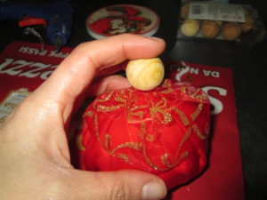 Ancora due punti di colla a caldo per fissare il cappellino e largo alla vostra fantasia, potete personalizzare il folletto con una campanella nel cappellino, con delle trine oro, con dei simboli della neve di legno o con una semplice campanella con scritto Buon Natale.