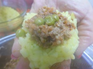 Prendete un cucchiaio abbondante di riso, adagiatelo sul palmo della vostra mano e appiattitelo, cercate di dare una forma un pò tondeggiante, versate all’interno il sugo di carne e piselli e cercate di chiuderlo un pò, qualora il composto non fosse ben coperto all’interno aggiungetevi altro riso, formate una palla modellandola bene con le mani.