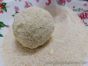 Passate l’arancina prima nell’acqua e semola poi nel pangrattato e modellate nuovamente con le mani.