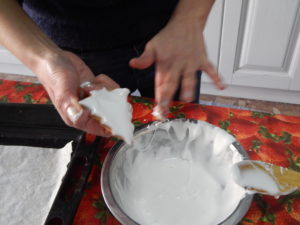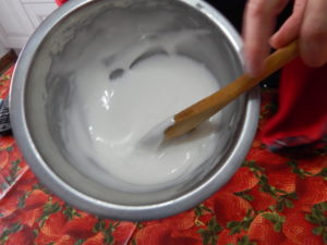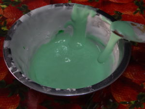 Nel tempo di attesa preparate la glassa, io per le dosi vado ad occhio, l’importante è che otteniate un composto omogeneo ben fermo, quindi lavorate energicamente lo zucchero a velo con il tuorlo se vi sembra molto liquido il composto aggiungete zucchero a velo, mettete una parte del composto bianco in una ciottolina e nel restante invece versate 4 gocce di colorante alimentare verde per fare gli alberelli (potete per comodità usare le fruste).