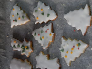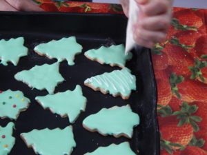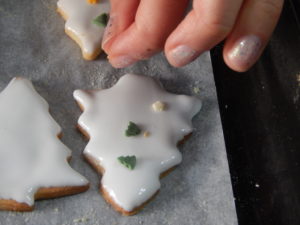 Decorate a piacere secondo i vostri gusti, io ho decorato gli alberelli di verde con dei festoni bianchi (ho messo la glassa bianca in un sacchetto realizzato con la carta da forno) e palline di zucchero, alberelli e stelline.