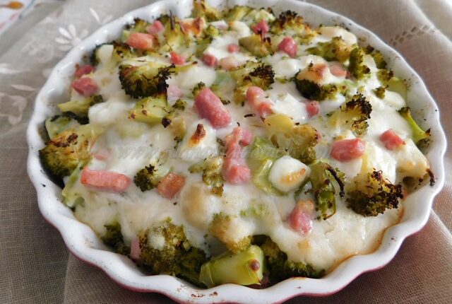 Procedete con l’aggiungere i broccoli resi a pezzetti piccoli, la pancetta, e i pezzi di mozzarella sparsi qua e la e un pò di besciamella.