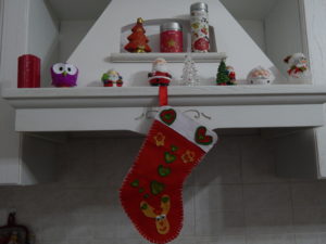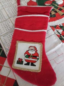 Vi mostro anche un’altra tipologia che ho realizzato,  prendendo una semplicissima calza in un negozio di casalinghi, anonima senza nessun dettaglio e vi ho applicato un lavoretto a punto croce, ho cucito con la macchina da cucire una trina color oro tutt’a torno e poi fissato il tutto con la colla a caldo sulla calza.