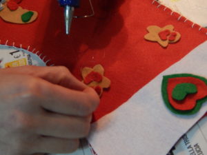Unite le due parti facendo il punto festone della lunghezza di circa 1 cm/1.5cm, se il pannolenci è rosso vi consiglio di cucire con il filo bianco, se verde con il rosso, comunque sempre con un colore che risalti bene.