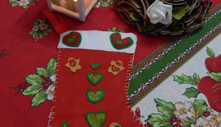 Vi mostro anche un’altra tipologia che ho realizzato,  prendendo una semplicissima calza in un negozio di casalinghi, anonima senza nessun dettaglio e vi ho applicato un lavoretto a punto croce, ho cucito con la macchina da cucire una trina color oro tutt’a torno e poi fissato il tutto con la colla a caldo sulla calza.
