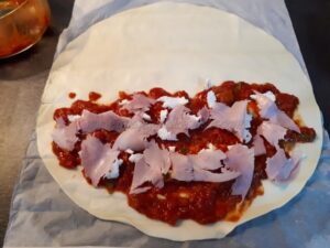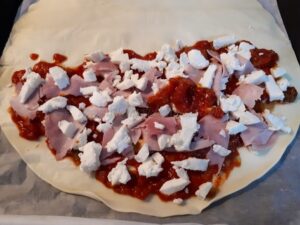Srotolate la pasta sfoglia, versate per metà precisa la passata di pomodoro, la mozzarella i pezzetti di prosciutto cotto.
