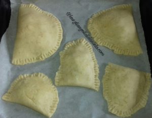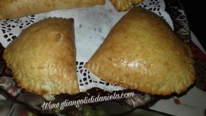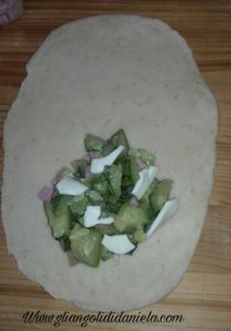 Trascorso il tempo, dividete l’impasto in palline e con il mattarello stendetele e adagiatevi il ripieno di zucchine, prosciutto cotto e formaggio filante, spennellate i bordi con dell’acqua e chiudeteli bene con l’ausilio di una forchetta per evitare la fuoriuscita del liquido delle zucchine o del formaggio.