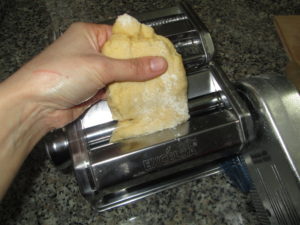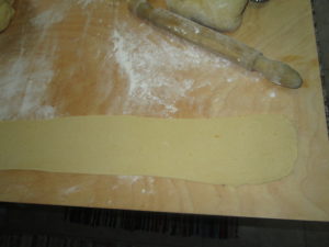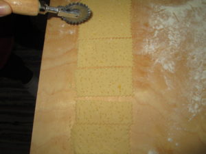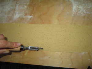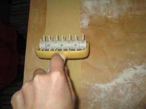 Trascorso il tempo, aiutandovi con la macchina per pasta tiratela poco per volta, bucate la pasta o con una forchetta o con il mattarello e punte,aiutandovi con una rotella tagliate i bordi in maniera ondulata e formate delle striscioline della misura che desiderate.