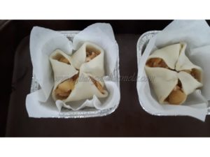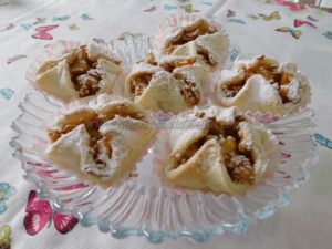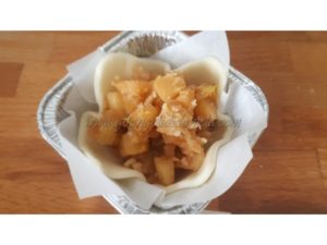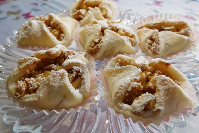 Srotolate la pasta brisèe, ritagliate sei quadratini di uguale dimensione,  adagiate ciascun quadratino di pasta su carta forno di circa ugual dimensione, inserite all’interno di uno stampino in alluminio quadrato o in degli stampi in metallo da muffin e con un cucchiaino versate all’interno il composto di mele.