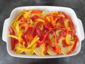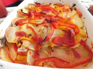 Create un’altro strato abbondante di cipolle, patate, peperoni e versate ad ultimo la passata di pomodoro, un ultimo filo di olio evo, sale.