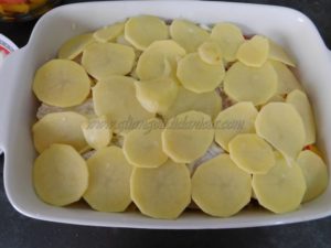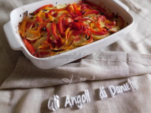 Create un’altro strato abbondante di cipolle, patate, peperoni e versate ad ultimo la passata di pomodoro, un ultimo filo di olio evo, sale.