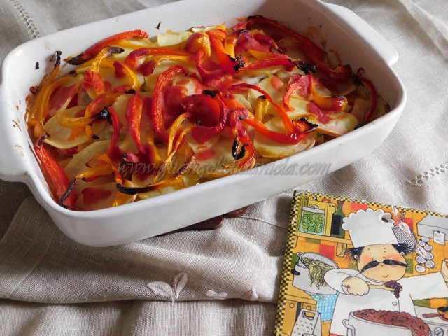 Sbucciate le patate e con l’aiuto di un taglia verdure rendetele a fettine molto sottili. Sbucciate le cipolle e sminuzzatele, pulite i peperoni eliminando i filamenti bianchi e tagliateli a striscioline.