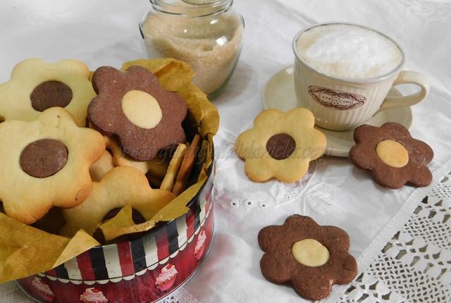 Lavorate fino a formare una palla (così anche per la frolla al cacao) e avvolgetele nella pellicola. Fate riposare in frigorifero per 30 minuti circa poi stendete la pasta con il mattarello su una spianatoia dello spessore di circa 5 mm, utilizzate un taglia biscotti a fiore, a stella o della forma che preferite e forate il centro. Ripetere l’operazione con la frolla al cacao.