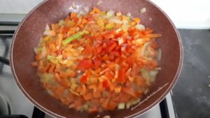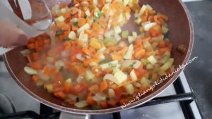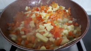 Incorporate le carote, il peperone e per ultima la patata in quanto a pezzetti così piccoli ha un tempo di cottura molto breve. Versate 1/2 bicchiere d’acqua e 1 cucchiaino di dado granulare bioSun San Martino, fate cuocere per 8/10 minuti.