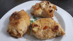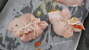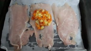 Stendete su della carta da forno i petti di pollo, batteteli leggermente con un batti carne e adagiate al centro di ciascun petto di pollo le verdure con l’aiuto di un cucchiaio.