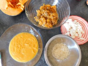 Lavate e pulite la zucca se preferite aiutatevi con un pela patate, permetterà di eliminare la buccia ma mantenere le proprietà presenti nello strato superficiale.Riducete a dadini e dividetela in due parti, una da 300 g e l’altra da 200g.