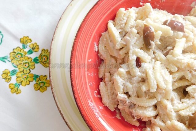 Nel frattempo scolate leggermente il tonno dall’olio, unitelo al cipollotto e ricotta, uniformate il tutto aggiungendo qualche cucchiaio di acqua di cottura per rendere la ricotta ancora più cremosa.