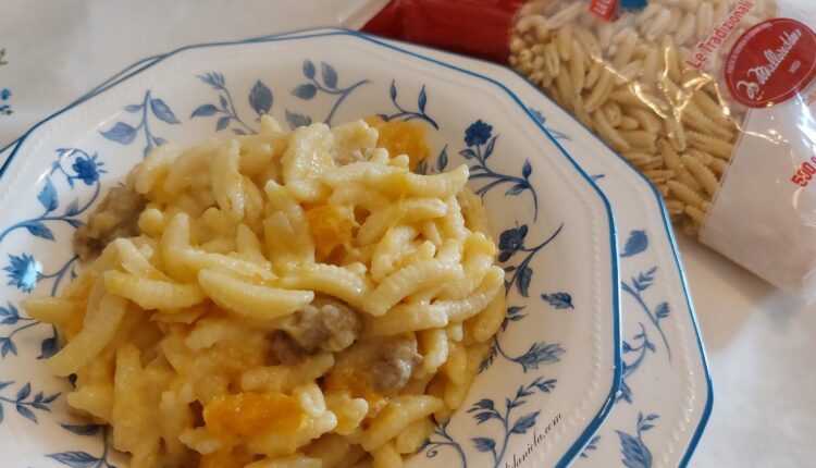 Decorso il tempo di cottura scolate i malloreddus e trasferiteli nel condimento di zucca e salsiccia, saltate per alcuni minuti, versate sopra la cremina di zucca frullata e impiattate.