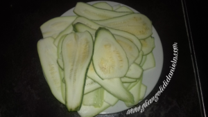 Lavate e spuntate le zucchine,tagliatele a striscioline sottili o con il coltello o con l’aiuto di un taglia verdure, asciugatele con della carta da cucina e passatele nella farina da entrambi i lati.