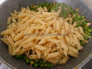 Cuocete le mezze penne in abbondante acqua salata anticipando di 3 minuti i tempi di cottura indicati sulla confezione. Scolate la pasta, versatela nella padella con i piselli e la pancetta, girate bene facendo saltare per qualche minuto poi versate la besciamella, amalgamate molto bene.