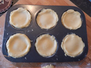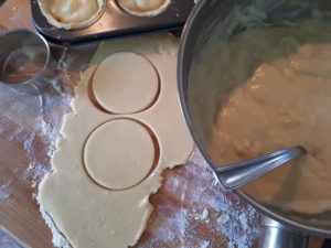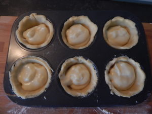 Decorso il tempo di riposo stendete la frolla, ricavate dei tondi con dei taglia pasta della stessa misura degli stampi per muffin, rivestiteli e versate all’interno o con il sacchetto o semplicemente con un cucchiaio.