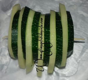 Inserite all’interno della patate le fette di zucchina o il prosciutto, se preferite potete alternare per dare più colore. Una volta riempita tutta la patata con un pennello da cucina spennellatevi sopra l’olio con gli aromi avendo cura di farlo fino in fondo per favorire una cottura uniforme sia della patate che della zucchina.