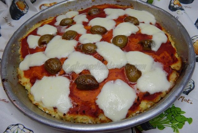 Sfornate la base di patate, disponete sopra la passata di pomodoro e le olive e proseguite la cottura per 20′ a 180°.