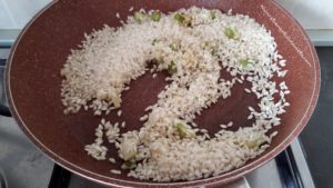 Soffriggete un cipollotto in un filo d’olio evo, versate il riso e fatelo tostare fino a che non risulterà trasparente, aggiungete a poco a poco mestoli di brodo.