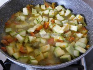 Preparate un soffritto con ½ cipolla, la carota e il sedano e fate imbiondire in una padella antiaderente con un filo d’olio evo, aggiungete prima i peperoni e fate rosolare bene per una decina di minuti, aggiungete la patata e continuate al cottura per altri 8/10 minuti e per ultimo aggiungete la zucchina a cubetti, salate, cospargete di prezzemolo e proseguite la cottura per altri 10/12 minuti.