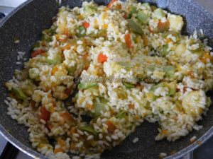 Nel frattempo, portate a ebollizione l’acqua, salate e fate cuocere per 15/16 minuti, scolate, versate il riso nelle verdure, amalgamate bene il tutto e versate il parmigiano.
