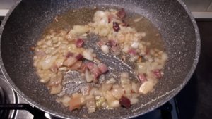 Tritate finemente la cipolla, fatela rosolate in una padella antiaderente con un filo d’olio evo insieme ad uno spicchio d’aglio. Dopo averlo tagliato a cubetti unite lo speck, rosolatelo bene e sfumate con 1/2 bicchiere di vino rosso.