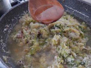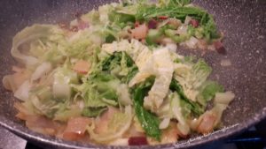 Aggiungete la verza e continuate a rosolare bene a fuoco medio per 8 minuti circa.