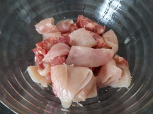 Tagliate la salsiccia a tocchetti di circa 4/5 cm e i petti di pollo dapprima a strisce poi a metà e metteteli a marinare e fateli riposare per almeno 4 ore.
