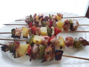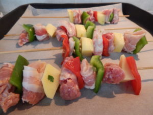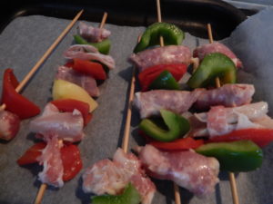 Decorso il tempo di marinatura componete gli spiedini alternando i pezzetti di salsiccia con il peperone e le patate e arrotolare 1/2 fetta di pancetta al petto di pollo, procedete cosi a piacere avendo cura di stringere bene l’un l’altra la carne.