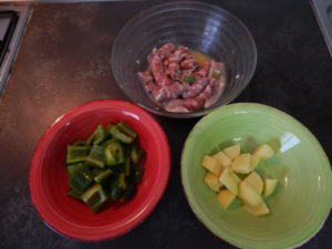 Lavate bene i peperoni, eliminate i filamenti bianchi all’interno e i semi e tagliate e quadretti non troppo piccoli, lavate e sbucciate una patata e tagliatela anch’essa a cubetti.