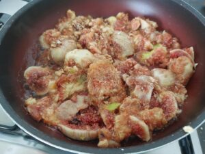 Nel frattempo preparate il ripieno, lavate e sbucciate i fichi, tagliateli, adagiateli in un tegame con lo zucchero semolato, il limone grattugiato e le noci e nocciole finemente tritate, fate cuocere il tutto per circa 10′ fino a quando non risulterà leggermente addensato.