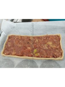 Riprendete la pasta frolla, stendetela con il mattarello sul piano di lavoro infarinato, formate un rettangolo e i lati di contenimento del ripieno dell’altezza di circa 2/2,5 cm, fateli aderire alla base facendo una leggera pressione.