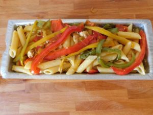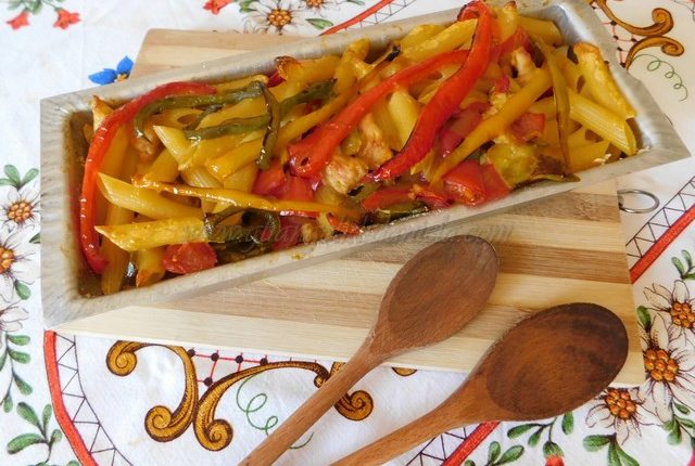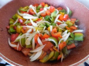 A cottura ultimata gocciolate e trasferite in una ciotola, versate in padella un filo d’olio evo, fate imbiondire la cipolla, aggiungete i peperoni, fate cuocere per 15/18 minuti, sfumando con 1/2 bicchiere di acqua a metà cottura.