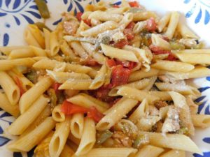 Versate il pollo e i peperoni all’interno di una ciotola capiente, rompete le uova, aggiungete il parmigiano, la pasta, il cucchiaio abbondante di curcuma amalgamate bene il tutto.