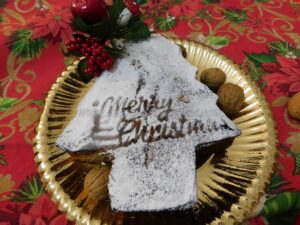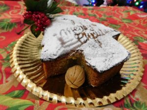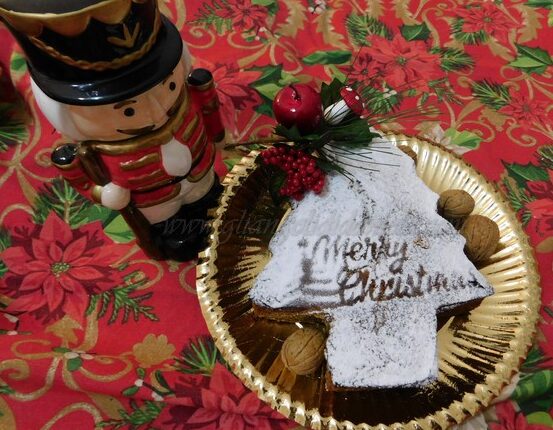 Non potevo non pensare ad un dolce, che unisse la famiglia in questo giorno di festa, magari da gustare a colazione o per merenda fra una decorazione e l’altra. Avevo in mente di usare la frutta secca, che mi ricorda il caminetto e le serate di Natale accanto a mia nonna a sbucciare noci, noccioline e pistacchi, così ho pensato ad una torta di noci, semplice ma a forma di albero di Natale, che rendesse il tutto ancora più allegro e gioioso.
