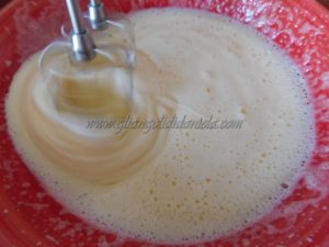 Lavorate le uova con lo zucchero fino ad ottenere un composto liscio, aggiungete a filo il burro fuso e il latte poco alla volta.