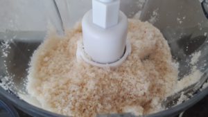 Macinate le mandorle con i 150 g di zucchero semolato utilizzando il mixer, fino ad ottenere un composto come la farina.
