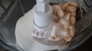 Macinate le mandorle con i 150 g di zucchero semolato utilizzando il mixer, fino ad ottenere un composto come la farina.