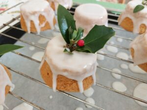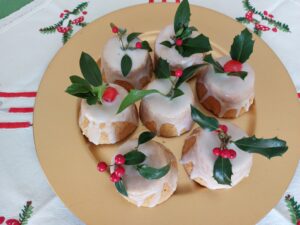 Ricordo che in una rivista in prima pagina c’erano delle tortine proprio come quelle che ho realizzato, con una bella glassa bianca e tante foglioline di agrifoglio e palline rosse, così ho deciso di prepararle e condividerle con voi.