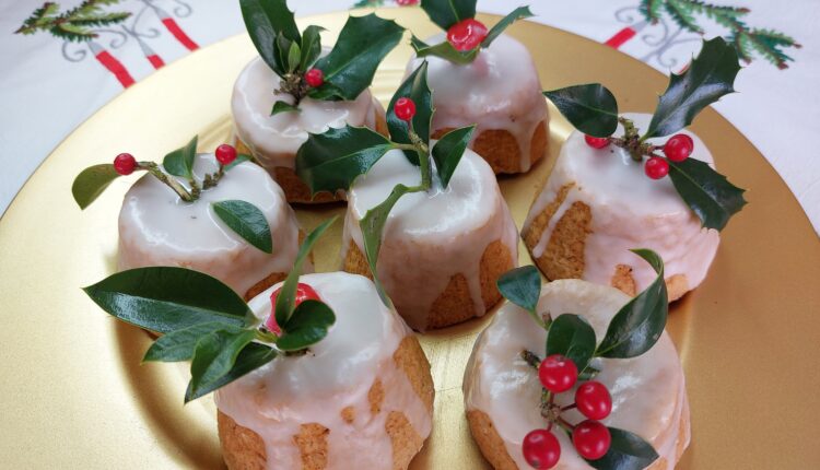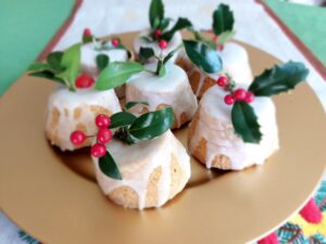 Ricordo che in una rivista in prima pagina c’erano delle tortine proprio come quelle che ho realizzato, con una bella glassa bianca e tante foglioline di agrifoglio e palline rosse, così ho deciso di prepararle e condividerle con voi.