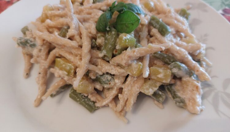 Le trofie, tipico formato di pasta ligure a forma sottile e allungata accolgono e si amalgamano bene ad una crema di ricotta, aglio, basilico, noci, zucchine e fagiolini.