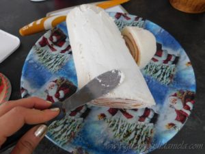 Eliminate la pellicola e tagliate in maniera obliqua una fetta dello spessore di circa 3 cm e adagiatelo affianco al tronchetto. Ricoprite interamente con del formaggio spalmabile facendo attenzione ad abbondare nella parte centrale in cui adagiate la piccola fetta.