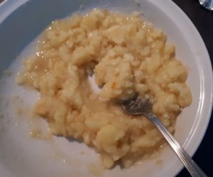 Prendere le patate, schiacciatele in un piatto con la forchetta come per fare un purè e aggiungete un mestolo di brodo.